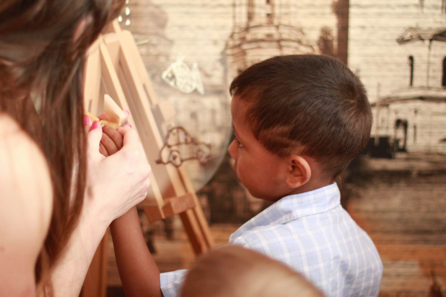 Рассказывают про шоколад (история возникновения), показывают по телеку как сами делают всяко-разные шоколадные прелести-вкусности, потом детки на палитре на стекле рисуют из конуса шоколадом картинки по очереди.